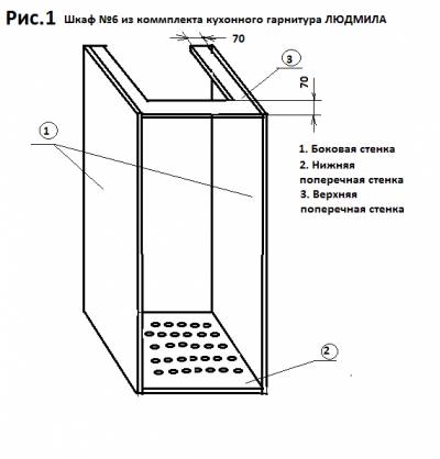 КАК ГАЗОВЫЙ КОТЕЛ ВСТРОИТЬ В КУХОННУЮ МЕБЕЛЬ В последнее время посетители сайта часто задают вопрос, как встроить газовый котел или колонку в кухонную мебель и просят поделиться секретом. Во-первых, никакого секрета нет. Во-вторых, современный дизайн и исполнение газовых котлов и колонок вполне вписываются в общий дизайн мебели. Если все же избежать встраивания газонагревательного прибора в мебель не удается, то необходимо обеспечить соблюдение всех мер безопасности и условий эксплуатации этого оборудования. Сам газовый котел (или колонка) должен быть оборудован как минимум двухуровневой защитой. На нем должны быть установлены датчики загазованности и отключения подачи газа. Это обеспечит автоматическое выключение котла при повышенной загазованности помещения и временном пропадании подачи газа. Кроме этого между элементами мебели и корпусом котла (колонки) должен обеспечиваться зазор, для того, чтобы мебель не нагревалась. Величина зазора может оговариваться в документации на газонагревательное оборудование, но чаще всего этой информации там нет, поэтому зазор должен составлять от нескольких сантиметров и более. Прежде всего рассмотрим, какие выдвигаются требования к шкафу для газовой колонки (котла): 1. Он монтируется после установки газового оборудования. 2. Конструкция шкафа должна обеспечивать свободный доступ к газовому оборудованию для его обслуживания и ремонта, а если необходимо, то и демонтажа и замены. 3. Шкаф должен обеспечивать конвекцию воздуха, которая обеспечивала бы нормальную работу газового котла (колонки). 4. Между внутренними стенками шкафа и внешними стенками газового оборудования должен обеспечиваться достаточный зазор, о котором я уже говорил. 5. В конструкции шкафа не должны применяться легковоспламеняющиеся материалы. Предлагаю рассмотреть конструкцию шкафа для скрытия газового котла и удовлетворяющего вышесказанным требованиям на примере того, который был применен в кухонном гарнитуре Людмила. В общем-то, этот шкаф (см. шк.6 Рис.1 «Кухонный гарнитур Людмила») нельзя назвать шкафом в полном смысле этого слова. Во-первых, в этом шкафу отсутствует задняя стенка, что обеспечивает возможность его монтажа при установленном котле. Во-вторых, в верхней поперечной стенке делается прямоугольный вырез, который обеспечивает не только зазор между внутренним торцом этой стенки и газоотводящей трубой, но и дополнительный зазор для увеличения свободного пространства для конвекции воздуха. В принципе, можно вообще обойтись без верхней поперечной стенки (что иногда я и практикую), достаточно сделать узкую горизонтальную планку шириной от 7 см, задачей которой является фиксация боковых стенок шкафа в верхней части конструкции, а в случае крайней необходимости, можно обойтись и без нее. В третьих, в нижней поперечной стенке делается частая перфорация для свободного доступа воздуха. По опыту, отверстия должны быть диаметром не менее 1,5 – 2см, и расстояние между такими отверстиями порядка 5 см. Отверстия можно делать и большего диаметра, и необязательно круглой формы, но в отверстиях больших размеров бросается в глаза отсутствие торцовочной ленты. Слишком большие отверстия выглядят не эстетично. Круглые отверстия очень технологичны и, при их расположении в определенном порядке (по углам квадрата, ромба