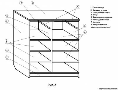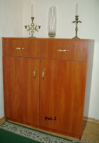 КОМОД ЕЛЕНА (особенности изготовления малогабаритной мебели) При проектировании и изготовлении мебели целесообразно оптимально использовать площадь помещения. Я не сторонник того, чтобы мебель загромождала все пространство, но мне также не нравится предельное минимизирование количества мебели в помещении. В каком-то фильме я видел, что в огромном помещении (около 200 квадратных метров) из всей «мебели» посередине стоял один унитаз. Конечно, оснащение своей квартиры (офиса) мебелью зависит от вкуса владельца этого помещения и его возможностей. Но, учитывая, что большинство обычных людей испытывают нехватку желанных квадратных метров, я считаю, что если оснащать помещение мебелью, то желательно занятую ею площадь использовать максимально эффективно. Однако, иногда возникает необходимость и в элементах мебели, которые имеют небольшие габариты. К таким элементам относятся обычные комоды, тумбочки и т.д. На Рис.1 представлено фото небольшого комода Елена. Кто-то может сказать, что изготовление комода, да и других малогабаритных элементов мебели, не требует особых умений и трудозатрат. Уверяю вас, изготовление комода (Рис.1) занимает не меньше времени, чем изготовление большого шкафа, такого, к примеру, как описан в статье «Многостворчатый шкаф». А ошибки в расчетах и дефекты, возникшие в процессе изготовления таких изделий, будут бросаются в глаза значительно сильнее, чем в больших шкафах и мебельных стенках. Особенности конструкции комода Елена представлены на Рис.2. Расчет деталей вы можете посмотреть здесь. Все детали комода, за исключением его задней стенки и днища выдвижных ящичков, выполнены из ламинированной ДСП толщиной 16 мм цвета «Кальвадос». Столешница и фасады комода отторцованы лентой ПВХ толщиной 1,5 мм. Остальные детали из ДСП торцевались бумажной декоративной лентой. Задняя стенка комода и днища выдвижных ящичков сделаны из ламинированной ДВП. В целях экономии можно применять не ламинированную (черновую) ДВП. Я же в данном изделии использовал накопившиеся у меня остатки материалов, что позволило значительно снизить себестоимость изделия. На Рис.1 и 2 видно, что комод конструктивно состоит из двух выдвижных ящичков и двух отделений с откидными фасадами. С целью упрощения монтажа комода в отделениях применялись только накладные полки. Для того, чтобы имелась возможность регулировать высоту размещения накладных полок, в боковых стенках и средней вертикальной стенке насверлены отверстия для установки полкодержателей. Упоры, применяемые в комоде, предназначены для упрощения процесса сборки. Конечно, можно обойтись и без них, но в таком случае при сборке комода необходимо задействовать двух человек, а это увеличивает трудозатраты. Как я уже говорил, порядок проектирования и изготовления данного комода ничем не отличается от того, что описан в статьях «Пошаговая инструкция изготовления корпусной мебели» и «Многостворчатый шкаф», поэтому я не буду повторяться. Такие элементы, как комод, целесообразно устанавливать в мансардных помещениях, где потолок с прилегающими стенами не образует прямой угол. Комоды можно использовать и в обычных помещениях, при этом столешница комода вполне пригодна для размещения на ней декоративных изделий или вазонов с цветами. Расчеты деталей комода выполнены и представлены в табл