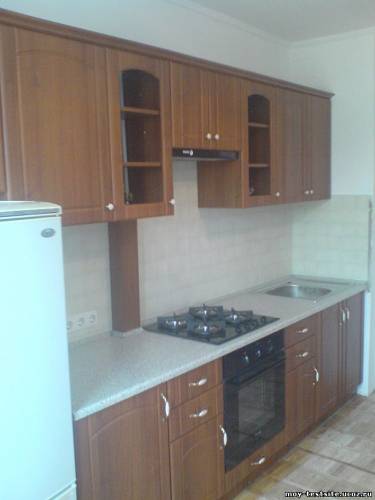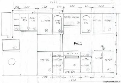 Общая схема кухонного гарнитура Юлия приведена на Рис.1. На схеме обозначены основные размеры элементов гарнитура и монтажные размеры. Размеры деталей и габаритные размеры элементов кухонного гарнитура Юлия вы можете посмотреть, если загляните в расчет деталей гарнитура. Длина нижней части отличается от длины системы антресолей, т.к. антресоли как бы «накрывают» холодильник. Левая сторона системы антресолей заканчивается открытой антресолью с тремя полками. Верхняя часть антресолей украшена декоративным карнизом из МДФ. С целью обеспечения возможности фигурного окончания левой части карниза все полки и верхняя стенка антресоли обрезаны под углом 45 градусов. Нижние шкафчики гарнитура монтировались на пластмассовые кухонные ножки. К передним ножкам с помощью съемных клипс прикреплен цельный единый цоколь, защищенный силиконовым подцокольником. В кухонном гарнитуре применены встроенная электрическая духовка, накладная газовая поверхность и накладная мойка из нержавеющей стали. Накладная телескопическая вытяжка удачно гармонирует с элементами конструкции мебели. Применение декоративного короба для скрытия труб позволило более эффективно защитить торцы столешницы с помощью декоративного плинтуса. Плинтус охватывает короб с трех сторон, это отлично видно на первых двух фотографиях общего вида. Деталировка кухонного гарнитура Юлия приведена здесь, там же вы найдете сведения о применяемых материалах. Расчет деталей выполнен таким образом, что если у кого-нибудь возникнет желание повторить подобный гарнитур, или его отдельные элементы, достаточно будет поменять основные размеры в столбцах «I», остальную работу за вас сделает программа «excel». При изготовлении данного гарнитура применялись методы и приемы, которые оговаривались в моей статье «Особенности проектирования кухонной мебели». Возможно, вам понадобится информация, которую вы сможете найти, если заглянете в «Каталог мебели». Напоминаю о том, что при изменении применяемых материалов у вас могут измениться размеры деталей. Также необходимо учитывать, что любая бытовая техника имеет свои монтажные особенности, которые могут повлиять на размер деталей. Иценко Александр Иванович | |