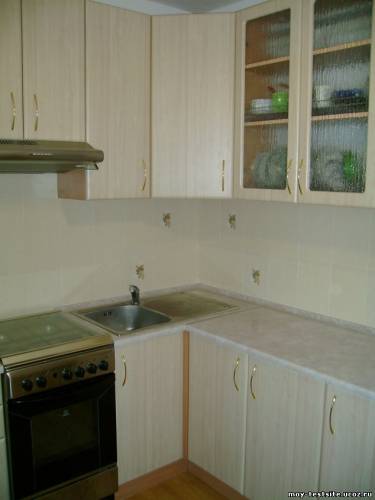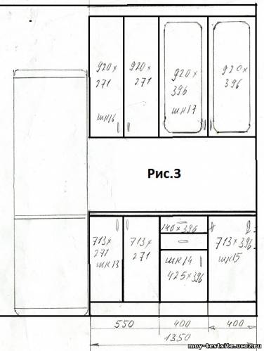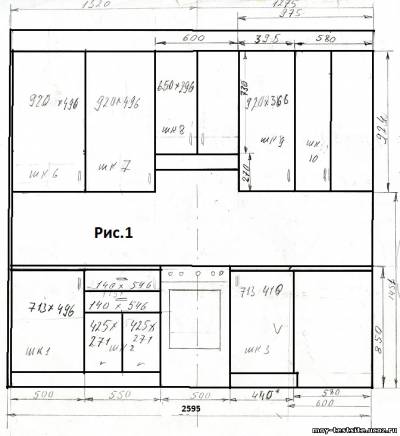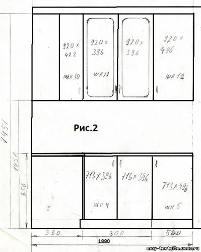 КУХОННЫЙ ГАРНИТУР ОКСАНА (особенности проектирования, изготовления и монтажа) Кухонный гарнитур Оксана я проектировал, пожалуй, в самых сложных условиях. Такого количества труб, как в помещении, предназначенном для этой мебели, я еще нигде не встречал. Трубы шли везде и вдоль, и поперек стен. Наверное, не было ни одной стенки, которую не пересекали водяные или газовые трубы, причем о строгом вертикальном или горизонтальном их расположении говорить не приходилось. Поэтому, к сожалению, полностью спрятать трубы, как я ни старался, мне не удалось. А еще, углы, которые составляли стены кухонного помещения, прямыми можно было назвать в очень большом приближении. Из-за ограниченности пространства не удалось сделать фотографии, которая отображала бы всю конструкцию этой мебели в сборе, поэтому я размещаю только некоторые фотографии отдельных фрагментов мебели и ее монтажные схемы, представленные на Рис.1,2 и 3. Фактически кухонный гарнитур Оксана состоит из двух частей – Г-образной части (Рис.1 и Рис.2) и отдельной прямой части (Рис.3). Угловая антресоль (Шк.10) выполнена по принципу, который детально описан в статье «Изготовление угловых шкафов для мебели Г-образной формы». При проектировании нижних шкафов применен тот же принцип, что и в Кухонном гарнитуре Лариса. Т.е. шкафы 3 и 4 расположены перпендикулярно. Это позволило избежать применения угловой мойки и, соответственно, лишних потерь полезной площади. Для того, чтобы выровнять стык столешниц левой и правой нижних частей Г-образной части мебели, в шкафу 4 применены дополнительные вертикальные упоры, которые крепятся снаружи левой боковой стенки, для обеспечения ее отступа от фронтальной стенки шкафа №3, на величину выступания фронтальной части столешницы над фасадами нижних шкафов. В данном случае эта величина составляет 16 мм. Высота нижней части гарнитура выбиралась исходя из высоты газовой плиты, которая установлена посередине нижней левой части гарнитура. Над плитой расположена накладная вытяжка. Сушилка для посуды размещена в антресоли Шк.11. К сожалению, заказчик самостоятельно выбрал довольно прозрачное декоративное стекло для фасадов типа «витрина», но это было его решение. Расчет деталей «Кухонного гарнитура Оксана» представлен в двух таблицах. Г-образная часть – здесь и прямая часть – здесь. Деталировка выполнена в программе «Excel» на основании базовых размеров, представленных на Рис.1,2 и 3, а так же в столбце «I» таблиц расчета деталей. В качестве основного материала для изготовления корпусов шкафов выбрана ЛДСП толщиной 16 мм. В качестве столешницы применен постформинг толщиной (Нстол.) 28 мм. Расчет деталей выполнен таким образом, что если кто-нибудь захочет повторить данный гарнитур, но со своими размерами, ему достаточно будет поменять базовые размеры, указанные в столбце «I», и программа сама выполнит расчет деталей. Нижняя часть мебели установлена на регулируемых кухонных мебельных ножках, изготовленных из пластмассы. Верхняя часть мебели (система антресолей) изготавливалась с учетом требований и рекомендаций, изложенных в статье «Особенности проектирования и изготовления верхней части кухонных гарнитуров». Ее монтаж производился на монтажную планку с помощью регулируемых навесов. Особенностью монтажа данного кухонного гарнитура являлось то, что в элементах м