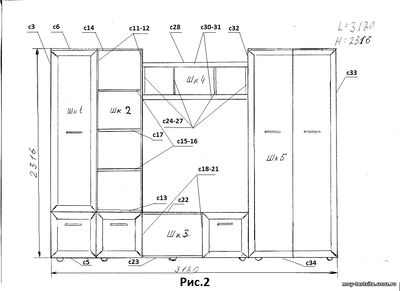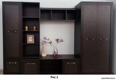 ОСОБЕННОСТИ ПРОЕКТИРОВАНИЯ И ИЗГОТОВЛЕНИЯ ГОСТИНЫХ ГАРНИТУРОВ В понимании большинства граждан постсоветских государств, гостиная – это помещение где принимают гостей или собираются все члены семьи для общего времяпровождения. И обязательными атрибутами гостиной являются стол, мягкая мебель и гостиный мебельный гарнитур, о котором пойдет речь в данной статье. Гостиный мебельный гарнитур также обладает характерными чертами. В его состав обычно входит несколько шкафов и тумбочка под телевизор, ну, а для более эффективного использования пространства гостиной, над тумбочкой под телевизор часто размещается какая-нибудь антресоль. Назначение шкафов в гостином гарнитуре зависит от достатка семьи, и общей жилой площади, которой располагает эта семья. Для среднестатистической семьи, под которую и планируются квартиры в современных многоэтажных домах, обычно один из шкафов гарнитура предназначается под книги или другие мелкие вещи, второй – для праздничной посуды, без которой не проходит ни одно застолье, ну а третий – платяной шкаф, естественно, для размещения одежды (выходных костюмов и платьев) хозяев помещения. Что касается тумбочки под телевизор и антресоли над ней, то эти элементы мебели иногда могут выполняться в виде единого шкафа. Там же (в тумбочке или шкафу) располагается и другая бытовая техника, предназначенная для обеспечения приятного времяпровождения (музыкальный центр, видеоплейер и т.п.). Вот, в принципе, и вся концепция проектирования гостиного гарнитура, который, как я уже говорил, предназначен для удовлетворения потребностей среднестатистической семьи. И, конечно же, следует отметить, что количество шкафов зависит от дизайнерского решения, а оно зависит от потребностей и возможностей заказчика. Кто-то может возражать, мол, телевизор уже уходит в прошлое, т.к. смотреть по нему абсолютно нечего. Платяной шкаф не нужен, т.к. обычно члены семьи имеют свои шкафы, где хранятся их одежда. Книги сейчас ушли в прошлое (все пользуются компьютерами и интернетом), а посуда, пусть даже и праздничная, должна храниться на кухне. Но прошу не забывать, что речь идет о среднестатистической семье, проживающей в типовом помещении, поэтому и гостиный гарнитур, который предлагается вашему вниманию, является типовым. Итак, давайте рассмотрим типовой мебельный гарнитур в гостиную комнату (см. Рис.1). Мои знакомые увидели его в одном из гипермаркетов, где был отдел продажи мебели, и, зная аксиому, что мебель, сделанная своими руками, значительно дешевле и качественнее той, что продается в магазине, попросили меня сделать деталировку и проконсультировать их во время ее сборки. Т.к. это мне не составило особого труда, я выполнил их просьбу. Ну а всю механическую работу (торцовку заготовок, сверление, фрезерование, подбор и покупку фасадов, и т.п.) мои знакомые выполнили самостоятельно. Правда, прежде чем приступать к работе, им пришлось почитать некоторые статьи из раздела моего сайта «Мебель своими руками». Конструктивно этот гостиный гарнитур состоит из 5 шкафов, точнее 3-х шкафов, 1-й тумбочки (см. шк.3 Рис.2) и 1-й антресоли (см. шк.4 Рис.2). Конструкция гарнитура представлена на Рис.2. С целью облегчения процесса сборки, на Рис.2 сделана привязка деталей к деталировке, которую вы можете скачать здесь. Сам расчет деталей выполнен в таблице Excel, и 