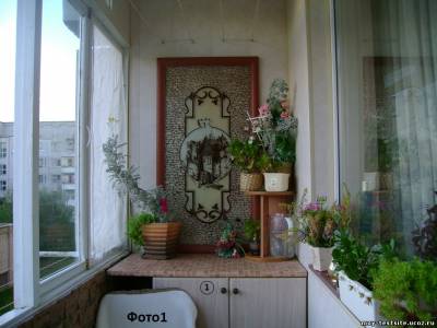 СИДУШКА НА БАЛКОН Когда проходишь по улице, невольно поднимаешь голову и смотришь, кто и как произвел обустройство своего балкона. И в большинстве случаев видишь, что балконы и лоджии многих людей используются не по назначению, а точнее - как обыкновенная кладовка (или, как говорит моя жена, «складовка»), куда народ стаскивает всяких хлам, который и выкинуть жалко, и в квартиру затаскивать противно. Конечно, некоторые присоединяют балконы к своим комнатам. Это они делают, видимо, от жадности, т.к. 3-4 дополнительных квадратных метра обычно не решают проблемы расширения жилой площади, а то, что они зимой греют улицу, а также уменьшают прочность здания, т.к. разрушили несущие стены, их особо не волнует, об этом они не задумываются. Как они говорят в таких случаях: «А чо мне думать. Пусть лошадь думает. У нее голова большая». Иногда хозяева квартир устраивают на балконах настоящие оранжереи, тогда глаз радуется, когда смотришь на такой балкон, если цветы подобраны со вкусом. Но, все же, чаще всего там оборудуется грязная «складовка». Вот и у меня была точно такая же, пока жена потихоньку меня оттуда не выжила и не заставила оборудовать балкон так, как ей было нужно. Я долго сопротивлялся, но пришлось уступить, а после того, как я закончил обустройство балкона, перестал жалеть, что пошел на поводу у жены. Внешний вид балкона представлен на фотографиях. Из материалов, которые мне пришлось закупить, было несколько квадратных метров пластиковой вагонки, пару квадратов искусственного камня и зимний клей для него. Ну, еще пришлось приобрести новую столешницу для старого кухонного шкафчика и рамку для витража. Остальной материал накопился за предыдущие годы и был именно тем хламом, который загромождал лоджию. В старом кухонном шкафчике (см.1 Фото1), оставшемся от старой кухни, и который было жалко выкинуть, я заменил столешницу и фасады. Фасады у меня остались после того, как я делал кухонный гарнитур Елена, и имел неосторожность ошибиться и заказать лишние (оплачивать, конечно, их пришлось из своего кармана, но нет худа без добра, вот они и пригодились). Столешницу по просьбе жены я сделал длиннее, чем шкафчик, чтобы можно было поставить больше вазонов с цветами, ее длину я брал из расчета ширины лоджии. Я не привожу точных размеров длины столешницы, т.к. не вижу в этом смысла. Все балконы (даже в одном и том же здании) стараниями строителей имеют разные размеры. Кроме того, ширина балкона уменьшается на размер, который зависит от применяемых отделочных материалов. Нишу, образовавшуюся между боковой стенкой шкафчика и передней стенкой лоджии, я использую для хранения раскладного столика в собранном виде, когда он не используется. Над шкафчиком по просьбе жены я разместил витраж, который установил в рамку из МДФ от рамочного фасада. Рамку пришлось заказывать, а вот витраж давно пылился в квартире и не мог найти своего применения. И выкинуть было жалко (денег стоит), и применить было некуда. Раньше стоял как декоративное стекло в межкомнатной двери. Ну а для того, чтобы было удобно сидеть за столиком и пить кофе (или что-нибудь покрепче) в приятной обстановке, пришлось смастерить сидушку на балкон (см.1 Фото 2), которую я изготовил из накопившихся остатков ламинированных ДСП, и которые остались после изготовления различной мебели. Как и большинство элементов м