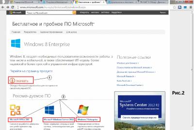 БЕСПЛАТНАЯ УСТАНОВКА ПЛАТНЫХ ПРОГРАММ ОТ MICROSOFT Здравствуйте уважаемые пользователи сайта. Предлагаю вашему вниманию статью, пожалуй, на одну из самых животрепещущих тем: «Как законно, но задаром пользоваться лицензионным программным обеспечением» или «Бесплатная установка платных программ от Microsoft». Наверное, многие из пользователей компьютеров представляют себе корпорацию Microsoft в роли этакого жадного монстра, который обдирает своих пользователей и не дает им шанса бесплатно пользоваться своим программным обеспечением. Но, смею заверить вас, это далеко не так. Хоть я и не питаю иллюзий по отношению к этой компании, но все же, надо быть хоть немного справедливым к ней (этой корпорации) и отметить, что она все же дает возможность воспользоваться бесплатно их платным программным обеспечением. Это делается с целью, чтобы дать возможность пользователям ПК в полной мере ознакомиться с новой продукцией, выпускаемой корпорацией Microsoft. Для этого данная компания выпускает пробные версии своих новых программ, причем срок работы пробной версии составляет 90 дней. А это не 30 и не 15, как предлагают некоторые другие компании. Возможностью бесплатной установки платных программ от Microsoft может воспользоваться любой пользователь ПК. Просто многие пользователи не знают о такой возможности. и поэтому часто прибегают к использованию нелицензионных программ, взятых неизвестно откуда, и, наверняка, с небольшими бонусами в виде троянов. А напрасно, пробные версии ПО корпорации Microsoft довольно неплохо себя зарекомендовали для продвижения новых продуктов этой компании. Кроме этого необходимо отметить, что корпорация Microsoft выпускает много интересных и совершенно бесплатных программ, которыми может воспользоваться любой пользователь ПК. Предлагаю сначала поговорить о пробных версиях платного ПО, разработанного в «застенках тайных лабораторий» Microsoft. К ним относятся полнофункциональные операционные системы Windows 7 и 8 Enterprise, Windows Server 2012, офисные программы Microsoft Office Professional Plus 2010 и 2013, Microsoft Office 365, а также многие другие программы. Все эти программы вы можете скачать с официального сайта Microsoft. Чтобы выйти на этот сайт, просто введите в поисковое поле вашего браузера ключевую фразу «бесплатное ПО от Microsoft». В результате ваш поисковик выдаст множество результатов поиска, первая ссылка среди которых приведет вас на нужную страницу официального сайта Microsoft (см. Рис.1). Меня часто спрашивают, почему я не даю прямую ссылку на сайты, которые рекомендую использовать? Ну, во-первых, поисковые системы (особенно «Яндекс» и «Рамблер») не любят, когда ссылаются на чужие сайты. Они могут просто не индексировать такие страницы, т.е. исключать их из поиска. Во-вторых, более-менее опытным пользователям интернета не составит труда найти страницы, на которые я ссылаюсь. И, в-третьих, неопытным пользователям неплохо самим потренироваться в поиске нужных страниц, тем более что я даю конкретные подсказки, как их найти. А те, кто не хочет напрягаться на поиски нужных страниц, могут ввести адрес с пояснительного рисунка, который прилагается ко всем моим статьям. И в любом случае, они могут обратиться за помощью через почтовую форму «Написать письмо». Итак, на странице «Бесплатное ПО от Microsoft» вы сможете выбрать интересующий вас продукт, пробную версию которого вы хотите обкатать в