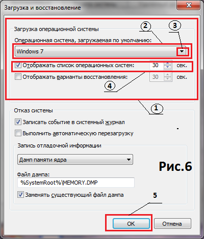 В следующем окне «Загрузка и восстановление» (Рис.6) вы можете выполнить настройки загрузки своего компьютера. В разделе «Загрузка операционной системы» (см.1 Рис.6) выберите операционную систему, которая будет загружаться по умолчанию (см.2 Рис.6). В моем случае – это «Windows 7». Если у вас система с двойной загрузкой, вы можете выбрать систему из выпадающего списка, который появится при нажатии на стрелочку 3 Рис.6. Если у вас обычная система, т.е. на компьютере установлена только одна операционная система (по крайней мере, вы раньше в этом были уверены), но в выпадающем списке у вас присутствуют еще операционные системы, возможно, такие же, как и основная, то, скорее всего, «специалисты» уже «ремонтировали» ваш компьютер, и, как я уже говорил выше, «поверх» вашей ОС поставили новую. Это не смертельно, но и хорошего тут тоже ничего нет. Во-первых, у вас на жестком диске, мягко говоря, не используется объем, занятый старой операционной системой, которую теперь вам уже не восстановить. Во-вторых, при каждом включении – выключении ПК у вас происходит перезапись системных файлов, и ваша операционная система при перезаписи может использовать поврежденные системные файлы из папки «Old Windows», и это снова может привести к краху системы, особенно для Windows XP. Поэтому все папки «Old Windows» целесообразно удалять, предварительно скопировав из них необходимые файлы.