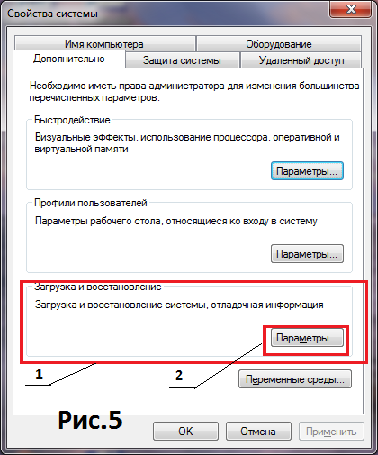 НАСТРОЙКА ПАРАМЕТРОВ ЗАГРУЗКИ КОМПЬЮТЕРА Еще с началом развития компьютерной техники получило широкое распространение одновременное использование на компьютерах двух и более операционных систем. Такие компьютеры (точнее системы) окрестили системами с двойной загрузкой. Для систем с двойной и более загрузкой большое значение имеет правильная настройка параметров загрузки компьютера. Этот параметр также необходим и для того, чтобы оценить состояние компьютера после того, как он побывал в ремонте, где «специалисты», которым вы доверили свой ПК, вместо ремонта операционной системы не придумали ничего умнее, чем установить «поверх» вашей операционной системы новую, причем, скорее всего, нелицензионную. И после такого ремонта на вашем ПК может находиться уже не одна, а несколько операционных систем. У меня, например, когда я только начинал осваивать компьютер, на моем ПК их было 3 или 4, сейчас точно не помню. Тогда я тоже задавал вопрос: «Откуда у меня появилась вторая операционная система?». Для персональных компьютеров наряду с необходимостью выбора операционной системы, которая должна загружаться по умолчанию, всегда важно иметь возможность выбрать систему, которая будет загружаться. Для этого и необходима настройка параметров загрузки компьютера с двойной загрузкой. Самый простой и безопасный способ настройки – это использование встроенных в систему утилит. Чтобы настроить операционную систему, которая будет запускаться на вашем ПК по умолчанию, необходимо в меню «Пуск» выбрать «Панель управления» (см.1 Рис.1). В открывшемся окне «Панель управления» необходимо выбрать «Система и безопасность» (см.1 Рис.2). В новом окне выбрать утилиту «Система» (см.1 Рис.3). Затем, в окне «Система» выберите вкладку «Дополнительные параметры системы» (см.1 Рис.4), после чего у вас откроется окно Рис.5. В окне Рис.5 выберите раздел «Загрузка и восстановление» (см.1 Рис.5), и нажмите кнопку «Параметры» (см.2 Рис.5).