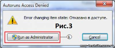 Хочу предупредить, что при попытке исключения из автозагрузки некоторых процессов ваша система может предупредить вас о недостаточности ваших прав и предложит запустить программу от имени администратора. Т.е. перед вами может появиться окно рис.3. Согласившись, нажатием кнопки «Run as Administrator» (см.1 Рис.3), вы запустите программу от имени администратора и повысите свой статус для управления процессами. Следует отметить, что для корректировки (удаления) некоторых процессов бывает недостаточно даже прав администратора. Например, многие антивирусные программы имеют защиту параметров настройки. И их изменение возможно лишь из окна настройки этой программы. И в заключение хочу сказать, что воспользовавшись информацией данной статьи и статьи «Изменение параметров автозагрузки ПК под управлением Widows», вы сможете оптимизировать процессы автозагрузки на вашем компьютере. Иценко Александр Иванович Статьи, посвященные подобной теме: 1. «Изменение параметров автозагрузки ПК под управлением Widows». 2. «Как проверить, нет ли на вашем компьютере троянских вирусов» | |