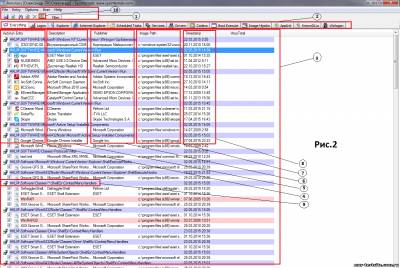 Теперь несколько слов об особенностях применения программы Autoruns для настройки параметров автозагрузки. Как отмечалось выше, данную программу можно запускать с любого носителя, подключенного к компьютеру. При этом сама программа не устанавливается на ваш ПК, не вносит (без вашего участия) изменений в реестр и не создает отдельного файла в папке Program Files. Вы можете распаковать архив программы в нужную вам папку, либо запустить программу непосредственно из архива. Для этого вам необходимо запустить файл Autoruns.exe, размером 657 Кб (см. 1 Рис.1), после чего перед вами появится окно Рис.2. Окно программы состоит из двух панелей инструментов (см.1 Рис.2), панели вкладок принадлежности процессов (см.2 Рис.2). Ниже расположено основное окно программы (см.3 Рис.2), вся информация в котором разбита на вертикальные колонки. Первая вертикальная колонка «Autorun Entry» (см.4 рис.2) состоит из чекбоксов, иконок, соответствующих программам или процессам, и названий программ (процессов), для которых запущен процесс автозагрузки. Наличие галочек в чекбоксах свидетельствует о том, что данная программа (процесс) присутствует в автозагрузке. Для того, чтобы исключить процесс (программу) из автозагрузки, необходимо убрать соответствующую галочку. Изменения вступят в силу после перезагрузки ПК. Вторая колонка «Description» (см.5 Рис.2) содержит информацию, описывающую программу (процесс). В следующей колонке «Publisher» (см.6 Рис.2) содержится информация об издателе программы (процесса). В четвертой колонке «Image Path» (см.7 Рис.2) отображается путь к файлу, запускающему процесс. И, наконец, в пятой колонке «Timstamp» (см.8 Рис.2) содержится информация о дате создания файла запускающего процесс. Вся информация программ и процессов, присутствующих в автозагрузке, сгруппирована по ключам реестра, в которых расположены параметры автозагрузки программ или процессов (см.9 Рис.2). Как отмечалось выше, чем меньше программ и процессов находится у вас в автозагрузке, тем быстрее будет работать ваш компьютер. При этом, убрав программу из автозагрузки, вы не удаляете ее, и, при необходимости, сможете ее запустить. Как это делать вы можете посмотреть в статье «Различные способы запуска программ». Не рекомендую бездумно исключать подряд все программы (процессы) из автозагрузки. Так можно отключить и драйверы устройств вашего ПК, как например, видеокарты, аудиокарты и т.п. Поэтому, прежде чем исключать программу (процесс) из автозагрузки, изучите его описание в интернете. Для этого в поисковом окне вашего браузера (желательно Google Chrome) введите название процесса. Из предложенных результатов поиска вас должно интересовать сочетание «название процесса + что это такое». Практически все процессы, присутствующие на вашем компьютере, описаны в интернете. А что отключать, вы должны определить сами, проанализировав описание каждого процесса. Возможно, во время ваших поисков вы выявите и вредоносную программу, которая присутствует на вашем ПК, и которую пропустил ваш антивирус. Следует отметить, что для некоторых программ, например CCleaner, невозможно изменить параметры автозагрузки с помощью органов настройки утилиты «Конфигурация системы» (см. статью «Изменение параметров автозагрузки ПК под управлением Widows»). Для таких программ изменения вступают в силу лишь после непосредственного внесения изменений в реестр опер