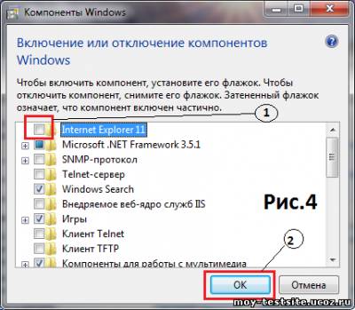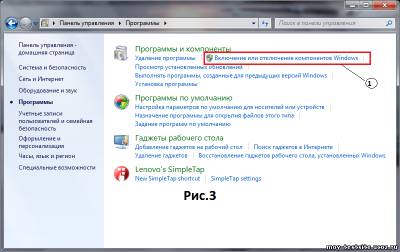 ВКЛЮЧЕНИЕ И ОТКЛЮЧЕНИЕ ПРОГРАММ ИЗ СОСТАВА ОПЕРАЦИОННЫХ СИСТЕМ WINDOWS Для обычных пользователей компьютеров считается абсолютно нормальным периодическое включение и отключение (установка и удаление) программ. Если это программы сторонних разработчиков, то тут проблем нет. Установка таких программ осуществляется путем запуска установочного файла с расширением «.exe». В качестве примера установки программы можно посмотреть статью «Установка пробной версии антивируса ESET Smart Security 6». Удаление программ можно производить, к примеру, с помощью «Панели управления», если там выбрать утилиту «Удаление программ». Этот и другие варианты удаления программ описаны в статье «Удаление не удаляемых программ». Ну а что делать, если программа является составной частью операционной системы Windows? Начнем с того, для чего нужно включать или отключать некоторые программы, которые входят в состав операционных систем семейства Windows? Программы сторонних разработчиков обычно вы удаляете по причине того, что они не удовлетворяют вашим запросам. При их удалении освобождается дисковое пространство. Программы, входящие в состав ОС Windows, удалить без переработки системных файлов не получится. Но есть возможность их отключения или включения (в зависимости от ваших потребностей). При этом сами программы не удаляются (они просто становятся «не активными», или, наоборот, «активными»). При этом дисковое пространство вашего ПК не меняется. Программы из состава ОС тоже могут вас не удовлетворять или даже просто мешать вам. Ну, к примеру, программа «Internet Explorer».Сейчас очень немногие используют эту программу (хотя она имеет свои плюсы, а поисковая система Bing довольно распространена), но эта программа постоянно «старается попасть вам на глаза» и поменять настройки вашего ПК. Или набор программ «Игры», а может какая-то одна игра из этого набора. Необходимость отключения набора программ «Игры» может возникнуть, если вы, к примеру, управляете работой офиса, и не хотите, чтобы ваши сотрудники драконили «Паука», или раскладывали «Косынку», вместо того, чтобы заниматься делом. Вообще-то, может возникнуть множество причин, которые вызывают необходимость включения и (или) отключения программ, входящих в комплект операционных систем Windows. И выполнение этих задач вполне реально. Предлагаю рассмотреть решение данной задачи на примере ОС Windows 7. Для операционных систем Windows ХР и более ранних разработок есть некоторые особенности, о которых будет сказано чуть позже. Итак, чтобы отключить (включить) какую-нибудь программу, входящую в состав операционной системы Windows 7, необходимо запустить утилиту «Включение и отключение компонентов Windows». Для этого в нижнем левом углу экрана нажмите кнопку «Пуск». В появившемся меню выберите «Панель управления» (см. 1 Рис.1). В открывшемся окне Рис.2 выберите раздел «Программы» (см.1 Рис.2). В новом окне выберите утилиту «Включение и отключение компонентов Windows» (см.1 Рис.3). Через некоторое время у вас откроется окно Рис.4. Рассмотрим процесс отключения программы Internet Explorer. Для этого слева от названия программы уберите галочку (см.1 Рис.4). У меня на Рис.4 эта галочка уже снята. Затем нажмите кнопку «ОК» (см.2 Рис.4). Возможно (а для программы Internet Explorer обязательно), у вас появится окно-предупреждение, которое предупредит вас о том, что поменяются настройки ваш