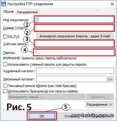 Рассмотрим пошагово, как реализовать предложенный алгоритм, кроме вопроса установки программы Total Commander, т.к. установка этой программы ничем не отличается от установки любой другой программы. Кроме этого, порядок применения программы Total Commander вы сможете изучить и на официальном сайте. Настройка сайта для работы по протоколу FTP Настройка сайта для работы по протоколу FTP фактически заключается в установке пароля доступа к сайту. Зайдите в «Панель управления» своим сайтом на главной странице. В зависимости от сервера, на котором размещен сайт (точнее его ПО), перед вами откроется окно, похожее на Рис.1. Правда, в нем сначала не будет отражаться окно «Помощник» (см.2 Рис.1). Приступаем к настройке. Нажмите на кнопку «FTP детали» (см.1 Рис.1). В вашем окне «Панель управления» появится дополнительное окно «Помощник» (см.2 Рис.1). Если вы еще не проводили настройку, то перед вами будет красоваться активная надпись «Пароль не установлен» (см.3 Рис.1). Вам необходимо нажать на эту надпись, после чего вы попадете в окно установки пароля для FTP (не показано). В этом окне вы должны дважды ввести придуманный вами пароль (не забудьте его сохранить в надежном месте) и ответить на секретный вопрос, который вы придумали во время создания сайта на хостинге uCoz. После сохранения пароля, вы снова попадете на главную страницу «Панели управления» сайтом с открытым окном «Помощник», которое несколько изменится и будет иметь вид, как на Рис.2. В этом окне уже не будет красоваться активная надпись «Пароль не установлен», а вместо нее вы увидите неактивную надпись «указанный вами пароль для FTP» (см.3 Рис.2). Теперь, если вы захотите изменить пароль для FTP, вы можете зайти в окно изменения пароля на вкладке «Безопасность» (см.4 Рис.1). Настройка программы Total Commander для соединения с сайтом Запустите программу Total Commander на своем компьютере. Перед вами откроется окно, похожее на Рис.3. Обратите внимание, что в окне программы Total Commander отражаются только диски, встроенные или подключенные к вашему компьютеру. Чтобы получить доступ к сайту, точнее, к его корневой папке, необходимо создать FTP соединение компьютера с сайтом. Для этого нажмите кнопку «FTP» (см.1 Рис.3) и в появившемся меню выберите пункт «Соединиться с FTP сервером» (см.2 Рис.3). После этого перед вами откроется окно Рис.4 «Соединение с FTP сервером». Для того, чтобы создать новое соединение, нажмите кнопку «Добавить» (см.2 Рис.4), после чего перед вами откроется окно «Настройка FTP соединения» (см. Рис.5). Вам остается заполнить соответствующие поля. В поле «Имя соединения» (см.1 Рис.5) введите уникальное имя, которое вы можете придумать сами. Обычно, чтобы не происходило путаницы, используется имя вашего сайта. В поле «Сервер [:Порт]», введите данные из строки «FTPhost:» (см.1 Рис.2). Вводить лучше всего методом копирования, чтобы не произошло случайной ошибки. В следующей строке «Учетная запись» (см.3 Рис.5) введите «FTP Login» из окна «Помощник» (см.2 Рис.2). Затем введите пароль в строке «Пароль» (см.4 Рис.5). Этот пароль вы создали на этапе «Настройка сайта для работы по протоколу FTP». И в завершение нажмите кнопку «ОК» (см.5 Рис.5). После этого ваша программа «Total Commander» выполнит соединение с вашим сайтом, и в одном из окон программы (левом или правом) появится список файлов, имеющихся в корневом каталоге вашего сайта. В моем случае они отображаются в левом окне пр